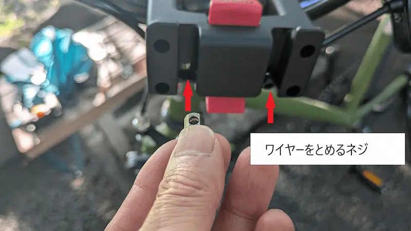 穴を上に向けてアタッチメントの穴に挿入、親指でかくれているがワイヤーをとめるネジがついている。